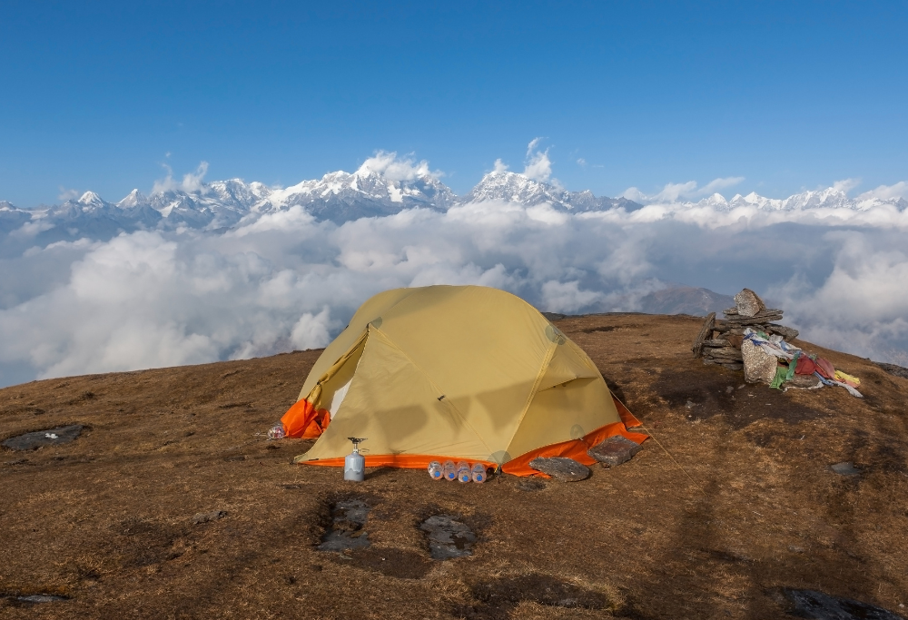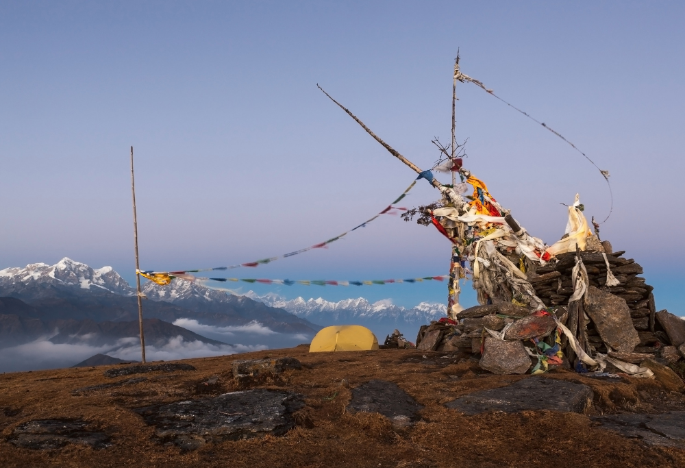 After Bhulbhule, the path splits, and we'll turn right to Pikey Peak. We'll pass some old yak houses and a long mani stone wall. Then the trail goes along the hillside unFrom Japre, the path goes up to a grassy ridge at Bhulbhule. There's one lodge here with nice der TaklungDanda through a pretty forested trail. There are lots of rhododendrons along a flat trail, which we can see in bloom if you hike in the spring. It takes about two hours to reach Pikey Peak base camp once you leave the forest. The top, at 4065 m/13336 ft, can be reached after a short climb. It's best to climb to the top in the morning to see the sunrise, unless the evening is exceptionally clear.